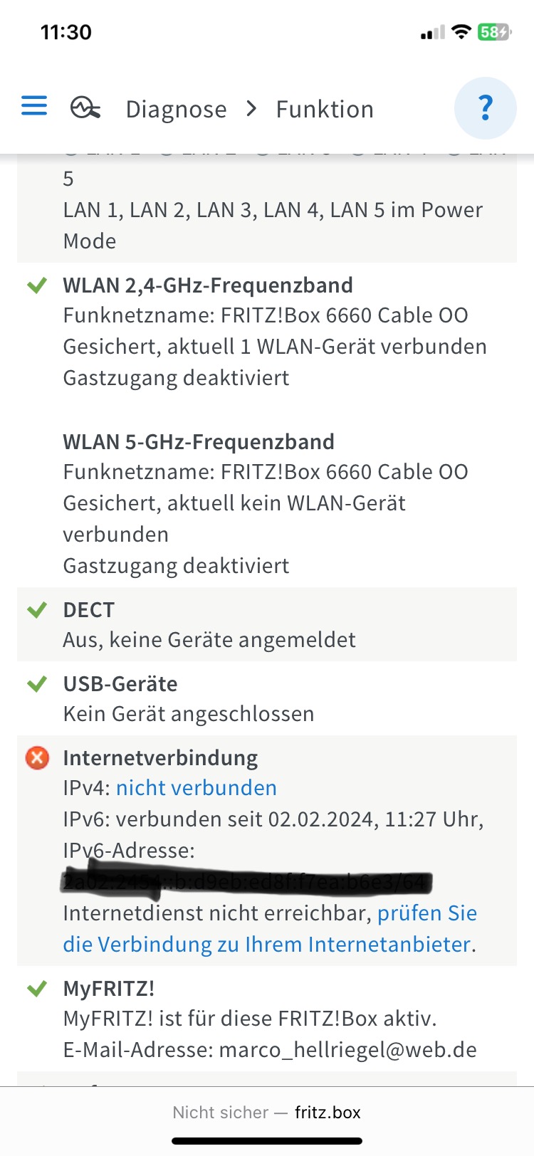 IPv6 Adresse: Verbunden, Internetdienst nicht erreichbar.
