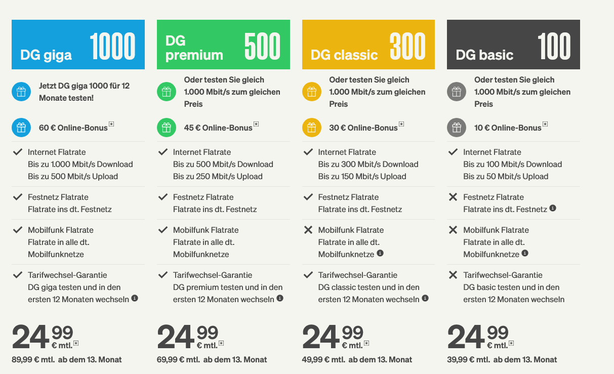 ich zahle aktuell 39,99€ im monat für 1000/500 leitung und dazu die passende leitung von DG erst 25€ dann 90€ im monat findest du billig? wenn du meinst
