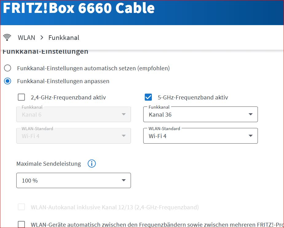 Warum sollte man 80 Mhz und 40 Mhz im 5Ghz nicht bei den Fritzboxen 6660+6670+6690 einstellen können ? Meine läuft auf Kanal 36+40 Wo ist bei dir da das problem? Willst du nur Kanal 36 ohne Kanal 40 ? Das währe dann 20Mhz und geht nicht :?
