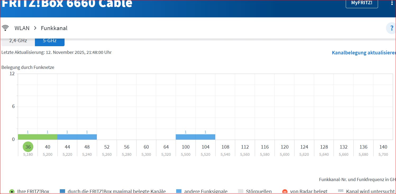 Wenn du beim 5GHz WLAN keine Aussetzer hast, bzw. Unterbrechungen (bei parallelem 2,4GHz und Geräte, die vernünftig wechseln können, merkst du mit Glück nicht wirklich was), würde ich mir da auch keinen Kopf machen. Ist ja abhängig vom Ort, ob und wie es zu Unterbrechungen kommt. Bei mir im Gebiet hatte ich mit der 6660 Cable ständig Aussetzer (trotz Kanal 36, weil die Kanäle mit den 160 MHz hineinragen). Was habe ich also von WiFi6? Es war aus dem Nichts immer mal weg. Und ob es mit eingestelltem WiFi 5 tatsächlich NUR mit 80 MHz sendet, weiß ich nicht. Habe aber in Erinnerung, dass ich auch damit Aussetzer hatte bei der 6660.