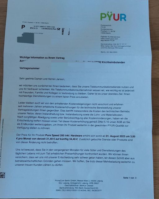 an dem Brief stört mich nur, dass im Footer "primaCom" steht und nicht PYUR.
