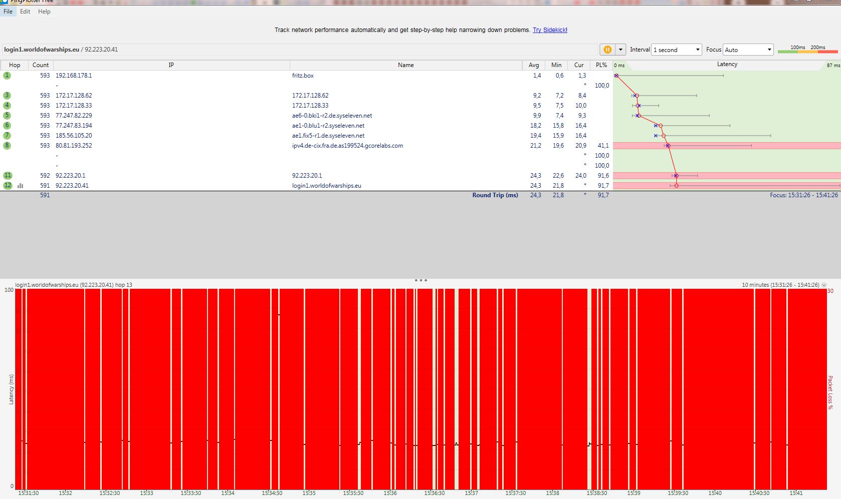 Spiele das Spiel World of Warships von Wargaming. Habe seit Montag das Problem das ich entweder mich gar nicht mehr einloggen kann oder nach dem ersten Gefecht rausfliege. Im Wargaming Forum haben auch andere Spieler das gleiche Problem und es sind alles PYUR Kunden. Anfrage seit 26.4. an den Pyur Support ohne Ergebnis man wollte sich innerhalb 24h bei mir meldem was aber nicht passierte. Alles andere Funktioniert einwandfrei nur das Spiel komm ich nicht mehr rein. Hab mal pingplotter Screen angehangen.